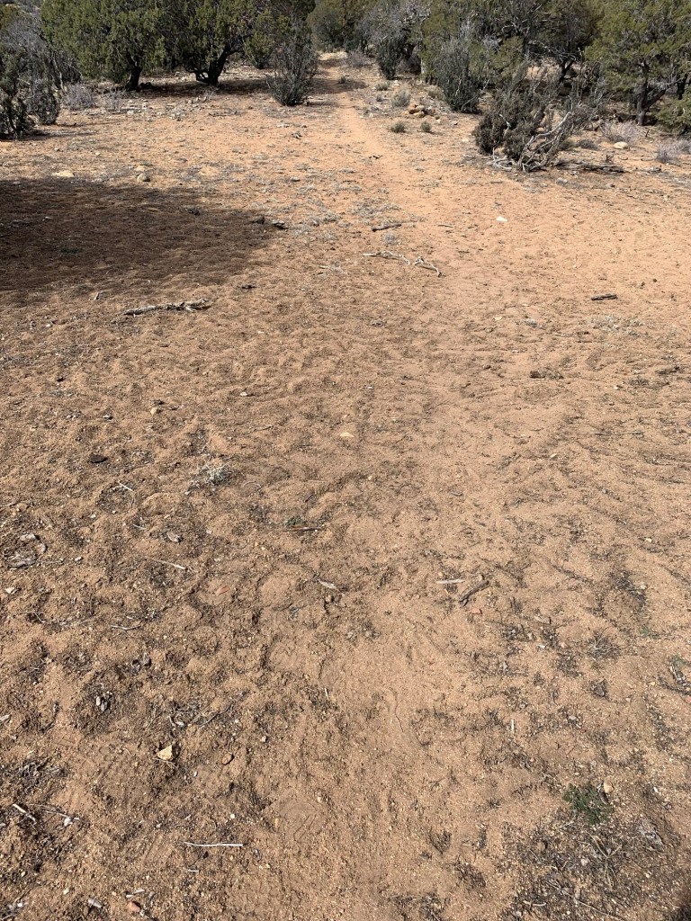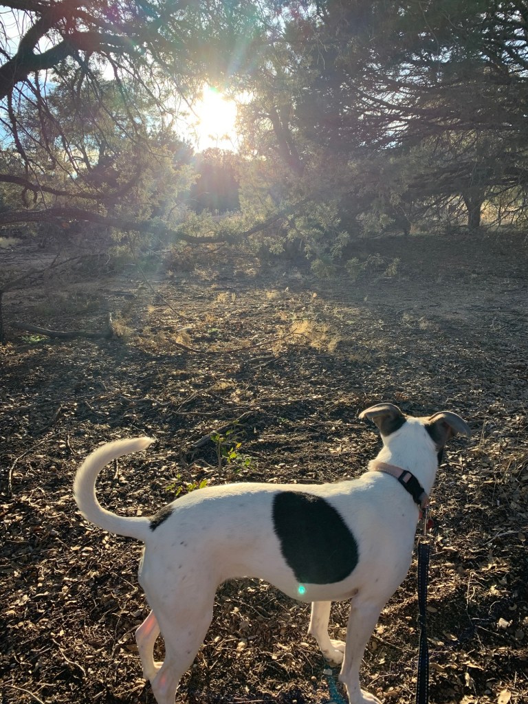 Down here, the ground is covered with tiny burs — sharp little hitchhikers just waiting for an unsuspecting paw. It took about ten different stops, ten different moments of me kneeling down to pull prickly reminders from her pads, before she finally started adjusting her method and staying on the path.